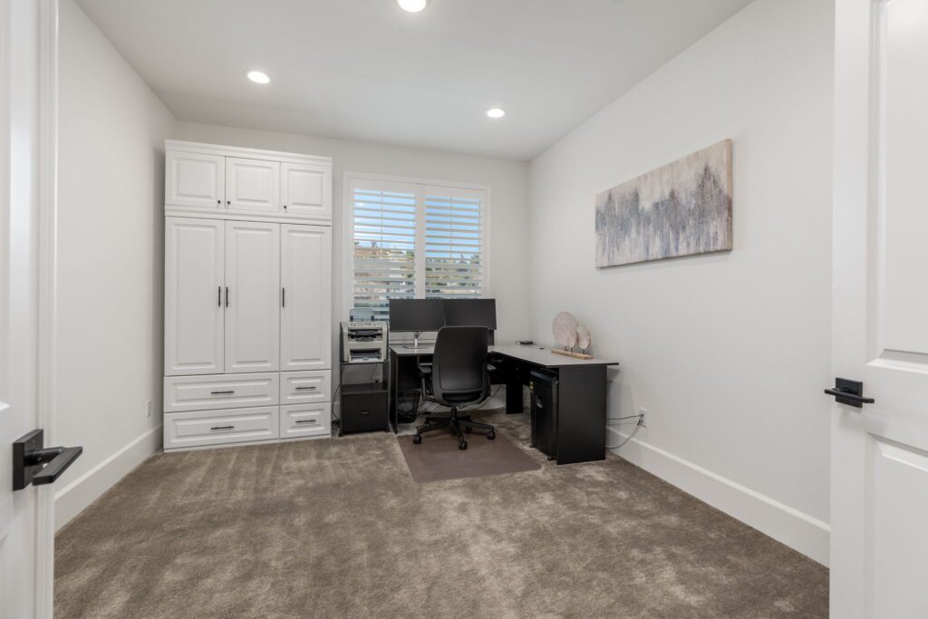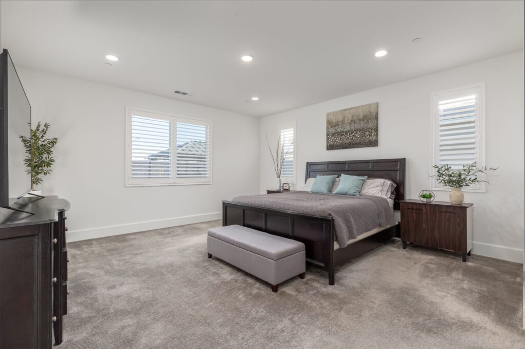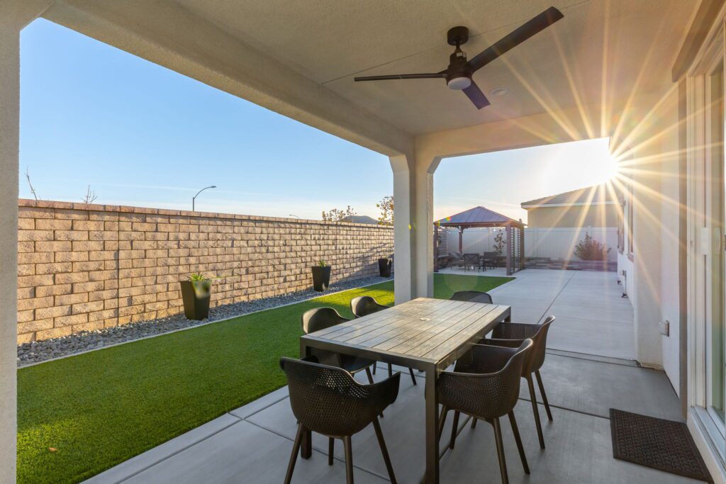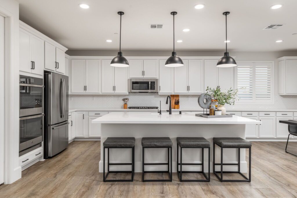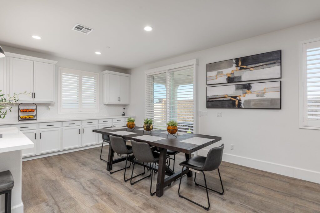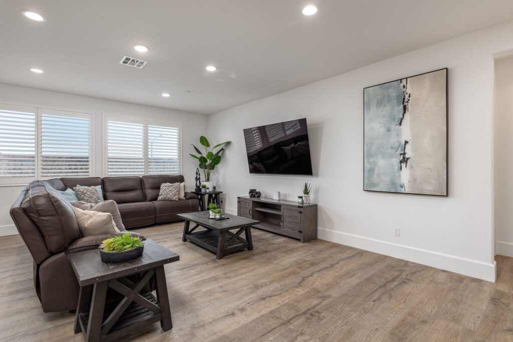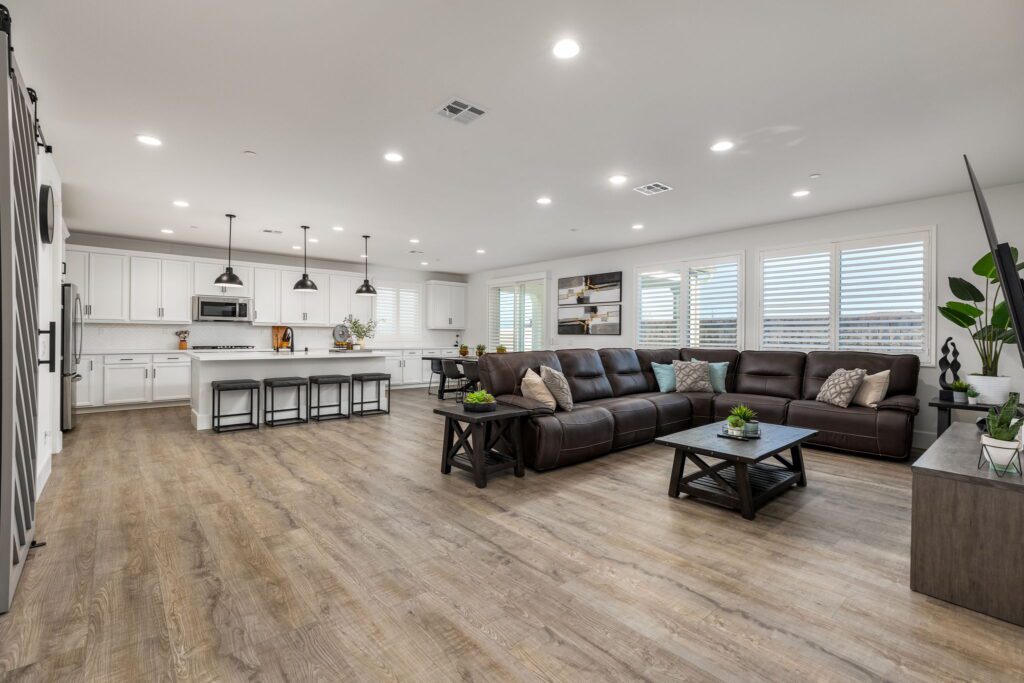 Located in the highly desirable Audie Murphy Ranch ~ built in 2022 ~ this Richmond American built Oxford plan is in excellent condition ~ basically a BRAND NEW HOME – only 2 years old with tons of Upgrades and an Open Floor Plan! No Rear Neighbors and enjoy Mountain Views in this 2,605 Sq Ft home with 3 bedrooms, 2 1/2 bathrooms, PLUS a Den/Office (that could easily be a 4th bedroom). Additional features include stunning upgraded Luxury Vinyl Plank flooring, Tall Baseboards, and a Tech Room. The front and backyards have been fully Landscaped (owner invested over $45k for landscaping alone). Ask about the MLS supplement for a full list of Upgrades (too many to list here!). As you enter, you are greeted by a spacious foyer that leads to a Flex Room, 2 secondary bedrooms and a full bathroom. Continuing on from the entryway, you have a convenient indoor Laundry Room, Powder Room and the entrance to your attached 2 car garage featuring Storage Racks and Epoxy Flooring. You will love the open floor plan as we head into the Living Room which is open to your stunning kitchen featuring Quartz Countertops, Extended Island, Pendant Lighting, Single Basin Undermount Apron Front Sink, beautiful Backsplash, GE gourmet kitchen package with Double Ovens AND the Extended Cabinets option that continues on to your dining area. Behind the barn door you will find the Tech Room with