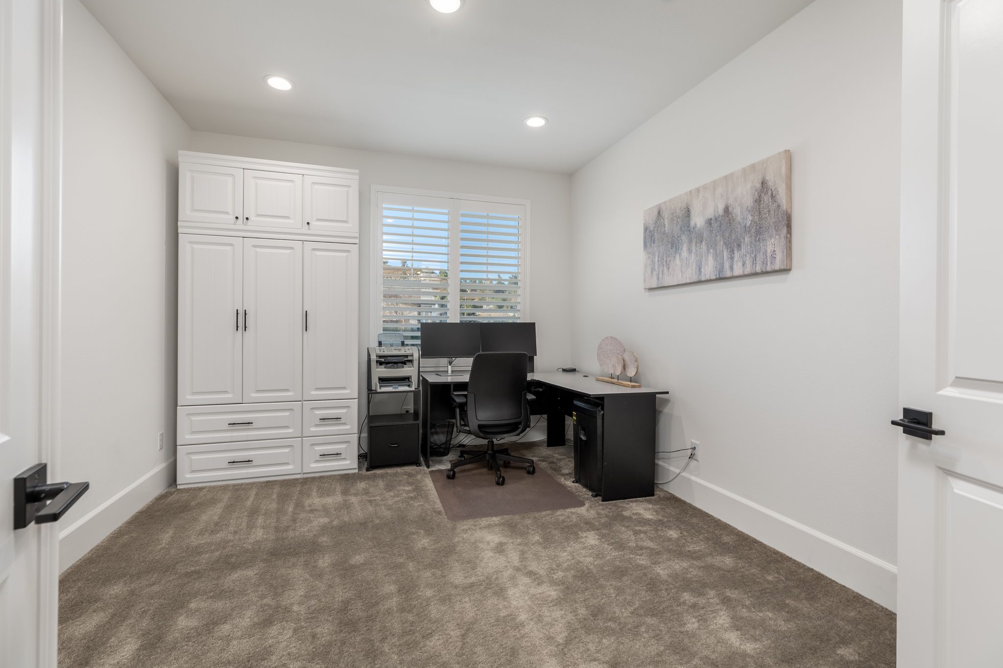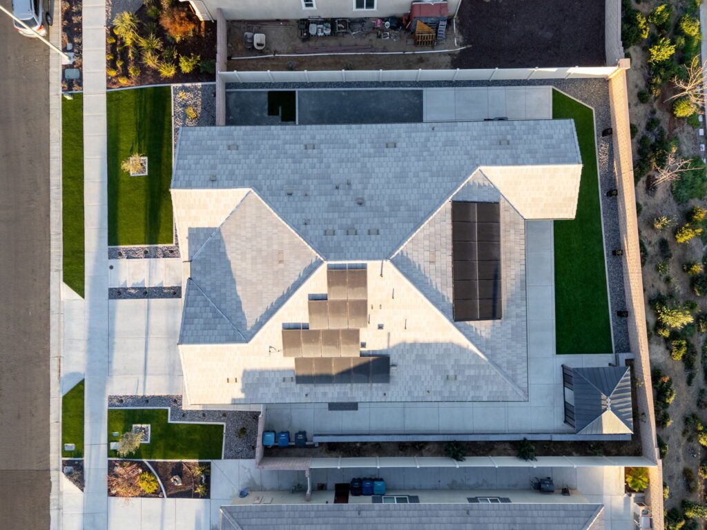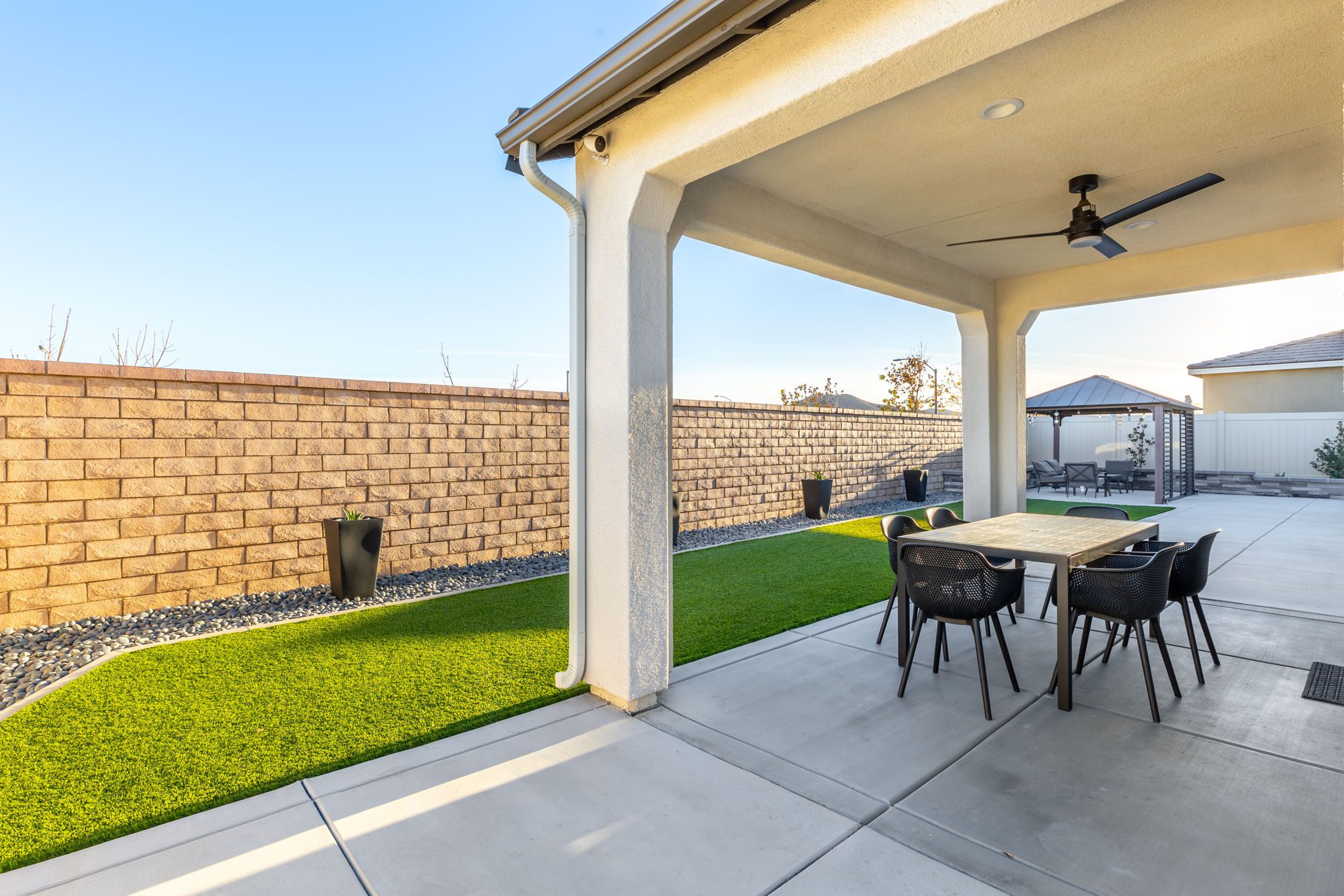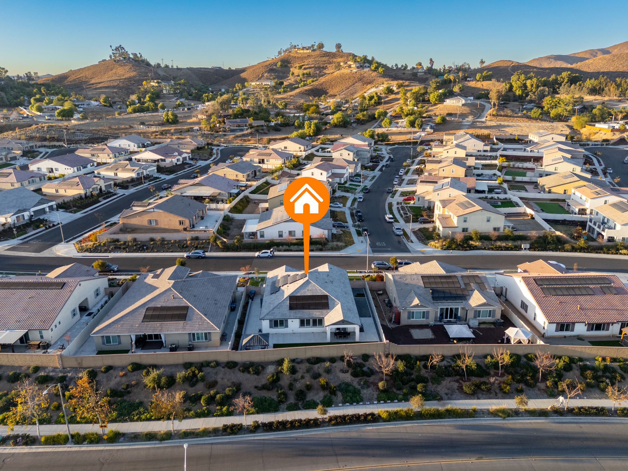 built-in desk and cabinets. Directly off the great room you will find the spacious primary bedroom with ensuite bathroom featuring a Soaking Tub, Dual Undermount sinks and a walk-in closet. Additional features include Matte Black Fixtures and Door Handles, Shutters on all windows, 26 Solar Panels (leased), Whole House Water Filtration System and Taexx Pest Control System . Relax and enjoy your beautiful backyard which includes a built-on stucco Patio Cover, Artificial Turf, Rain Gutters, Arizona Gray Pebble Rocks, plants and trees. Audie Murphy has tons of amenities. The Ranch House is the neighborhood hub: it has multiple resort style pools, a club house, kids play areas and a management team on-site with a full calendar of events for entertainment and opportunities to get to know your neighbors. There is also a Sports Park, plenty of restaurants and shopping nearby. The Elementary and Middle Schools are located within the community. Now is your chance to own a basically brand new home in the recently SOLD OUT Audie Murphy Ranch!