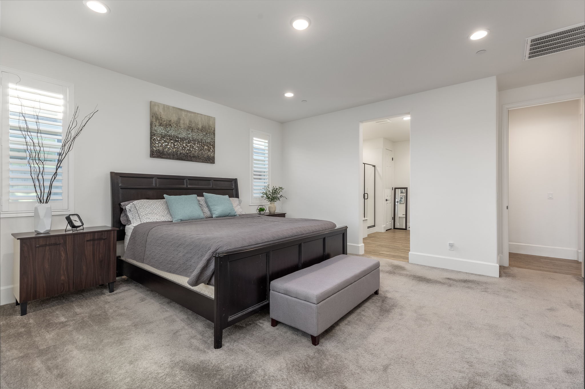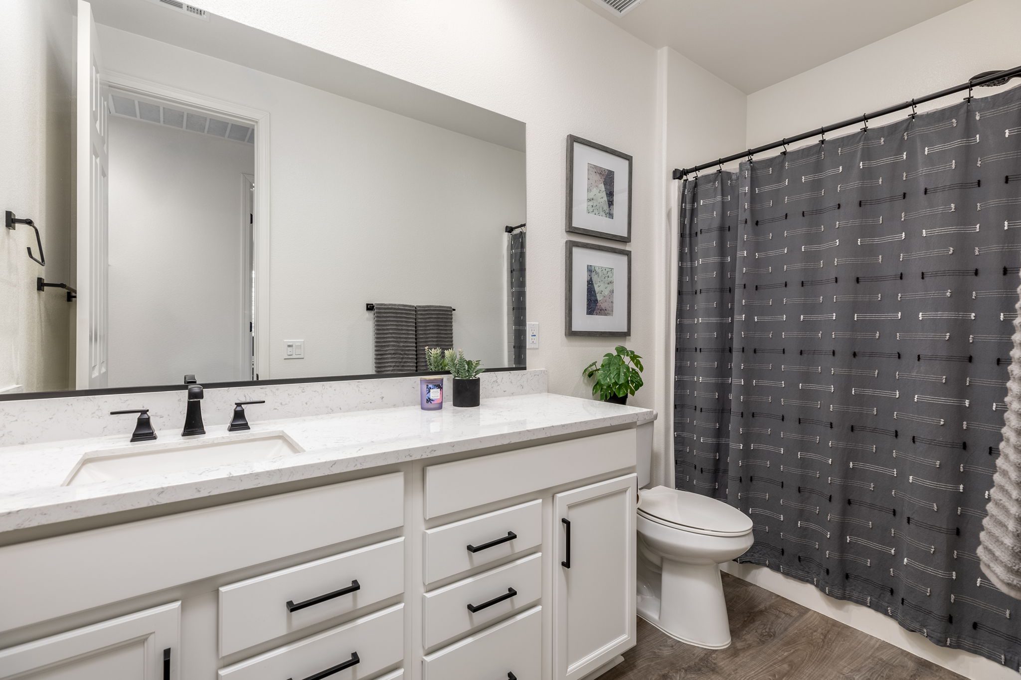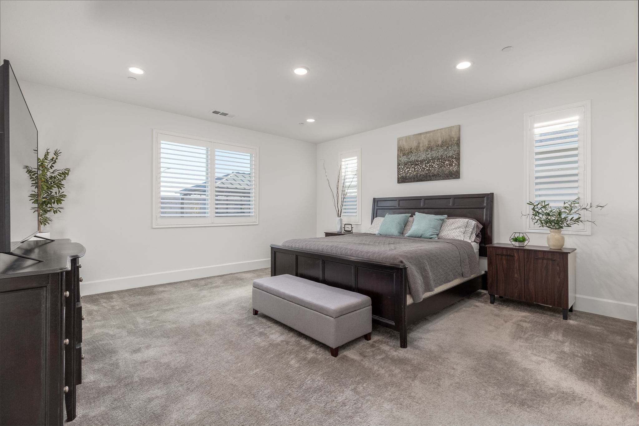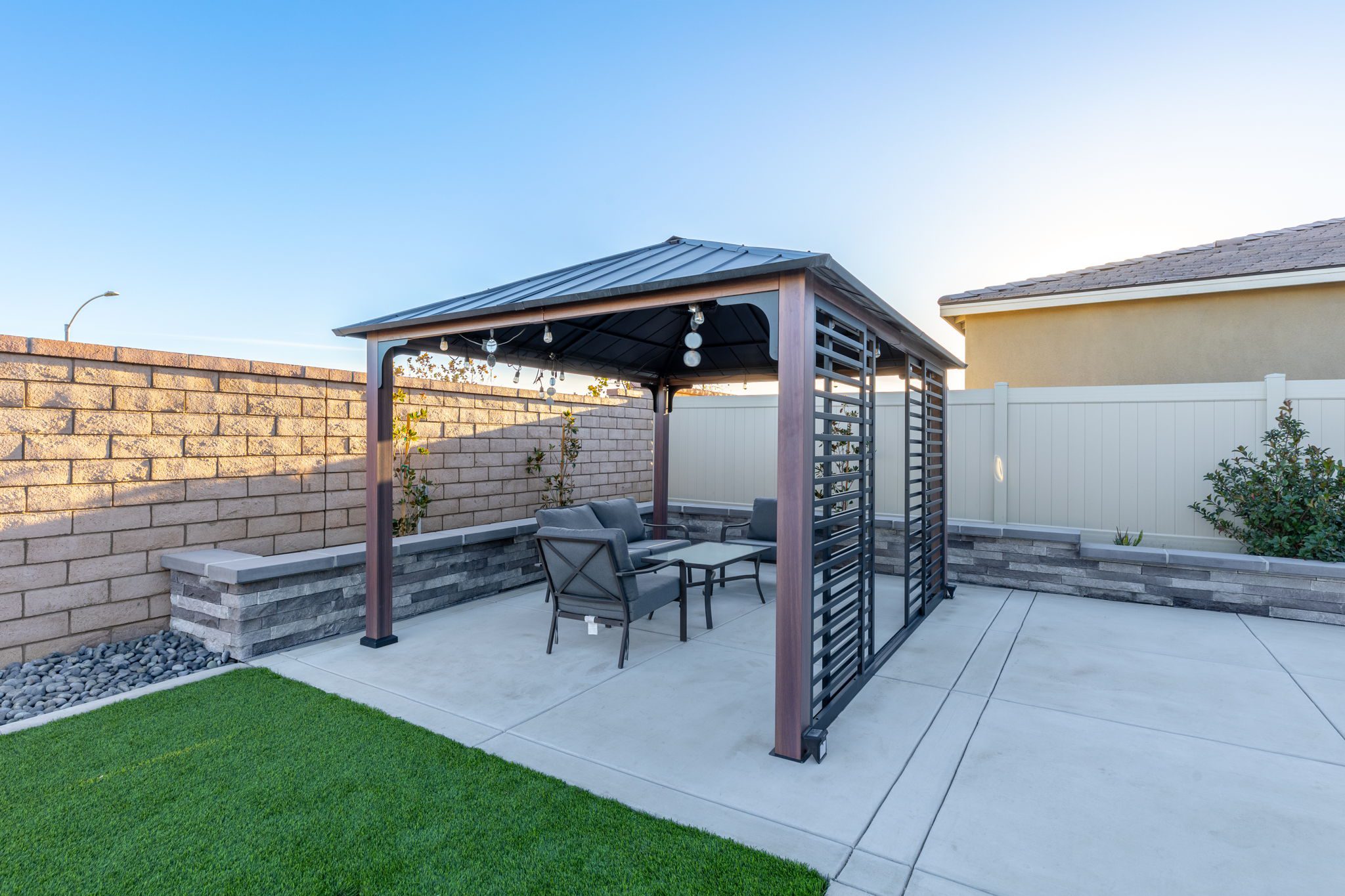 built-in desk and cabinets. Directly off the great room you will find the spacious primary bedroom with ensuite bathroom featuring a Soaking Tub, Dual Undermount sinks and a walk-in closet. Additional features include Matte Black Fixtures and Door Handles, Shutters on all windows, 26 Solar Panels (leased), Whole House Water Filtration System and Taexx Pest Control System . Relax and enjoy your beautiful backyard which includes a built-on stucco Patio Cover, Artificial Turf, Rain Gutters, Arizona Gray Pebble Rocks, plants and trees. Audie Murphy has tons of amenities. The Ranch House is the neighborhood hub: it has multiple resort style pools, a club house, kids play areas and a management team on-site with a full calendar of events for entertainment and opportunities to get to know your neighbors. There is also a Sports Park, plenty of restaurants and shopping nearby. The Elementary and Middle Schools are located within the community. Now is your chance to own a basically brand new home in the recently SOLD OUT Audie Murphy Ranch!