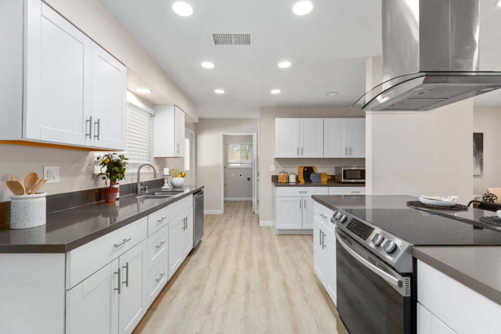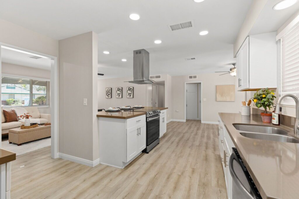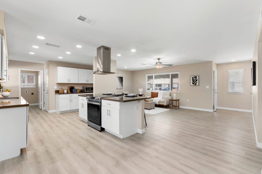 with luxury vinyl plank flooring, a stunning chef’s kitchen featuring quartz countertops, custom cabinets, and stainless steel appliances.