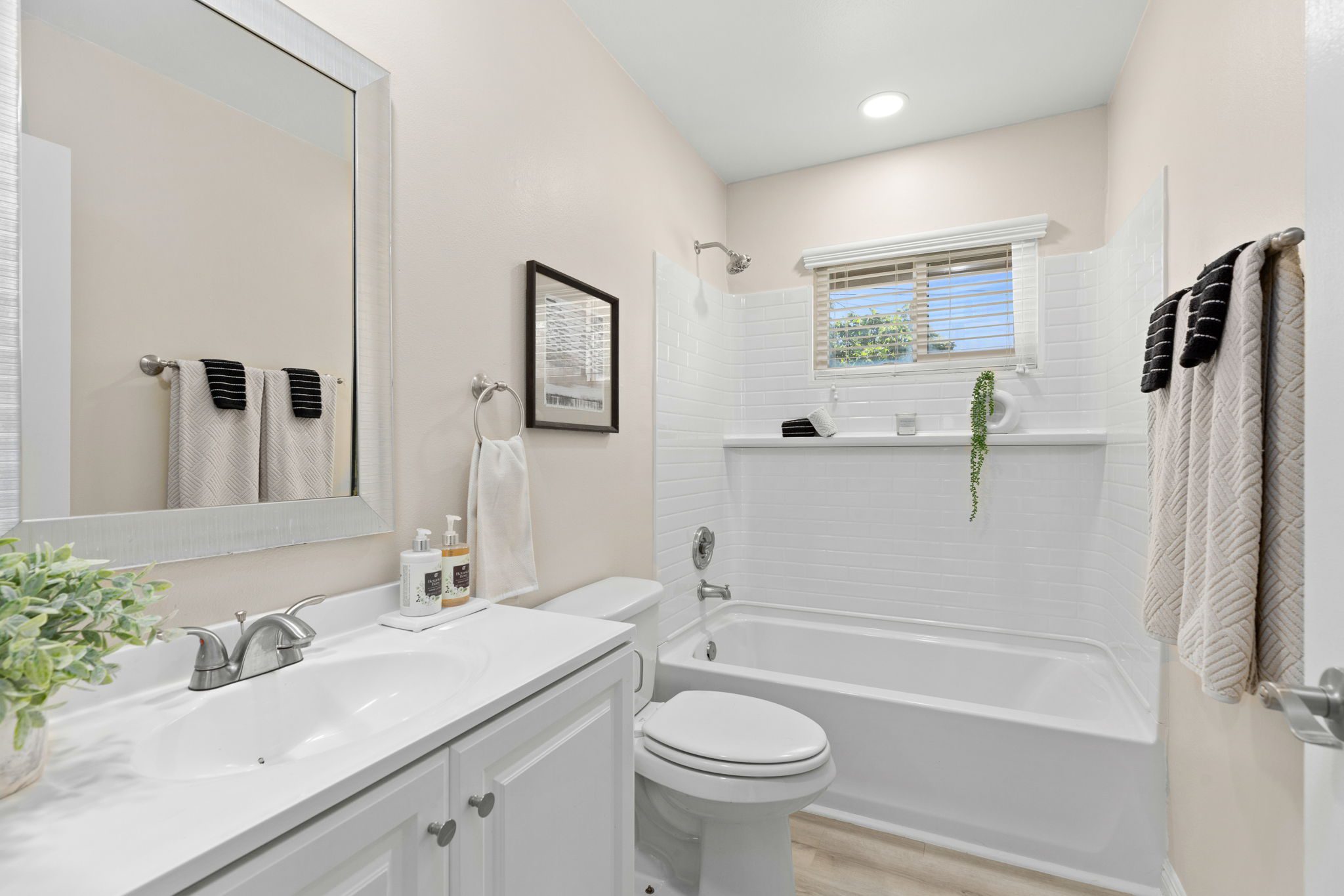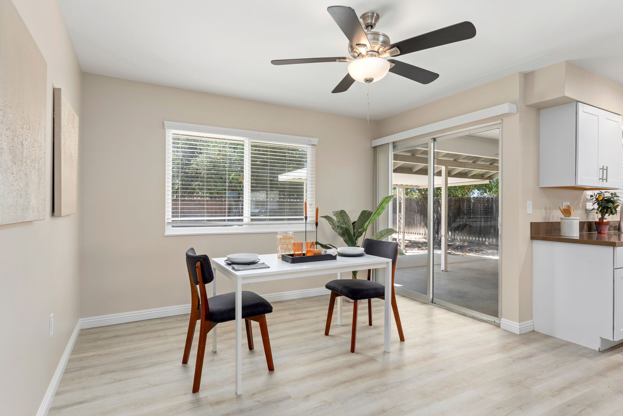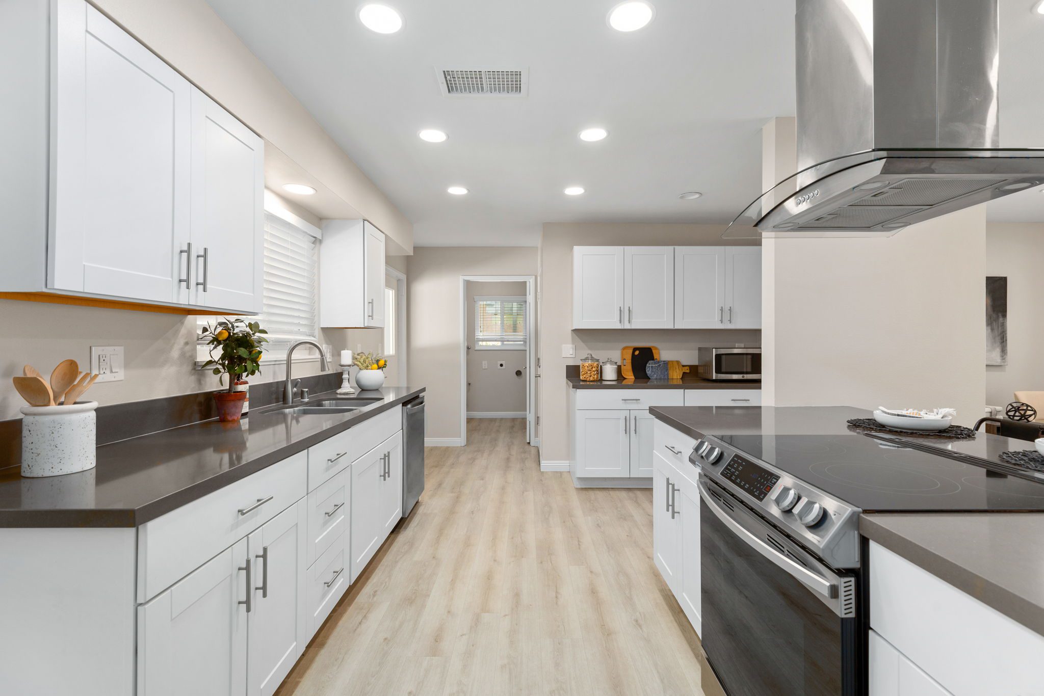 Enjoy modern recessed lighting, newer dual pane vinyl windows, and remodeled bathrooms. Includes an indoor laundry room, covered