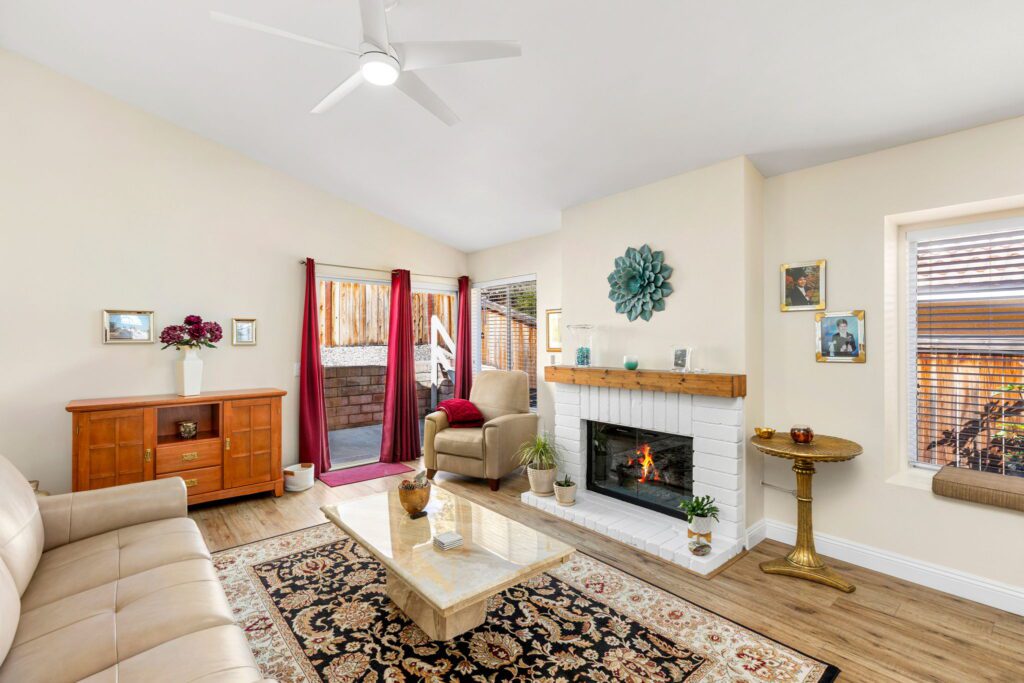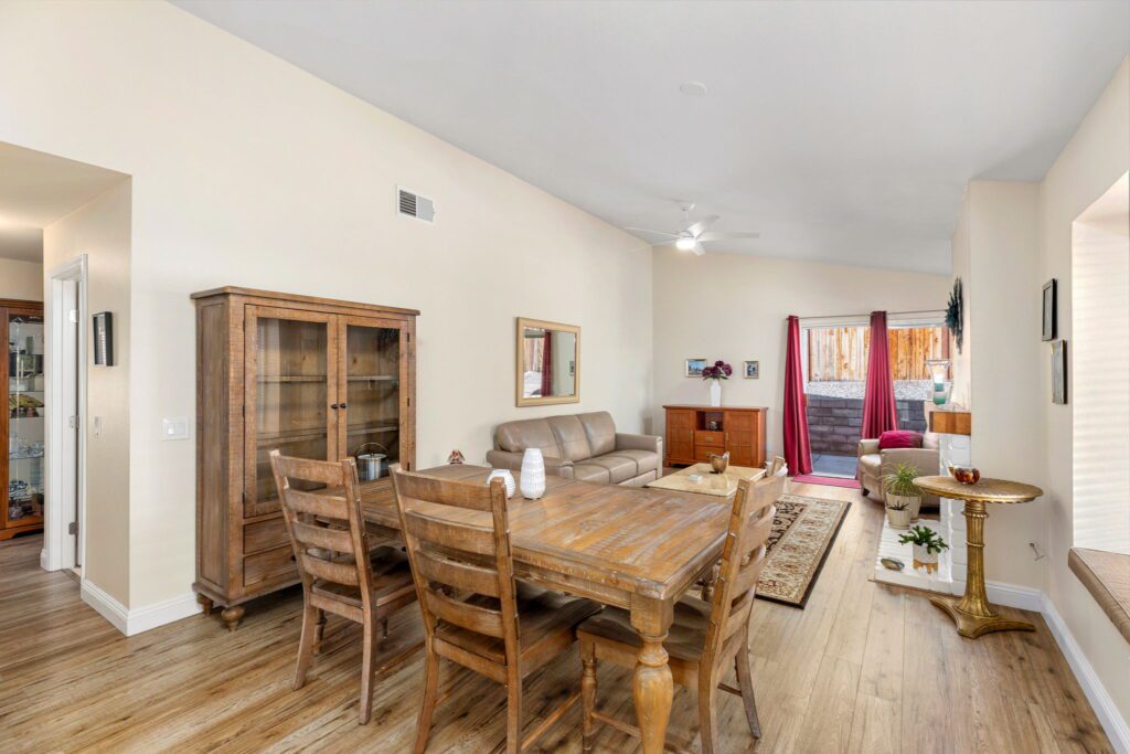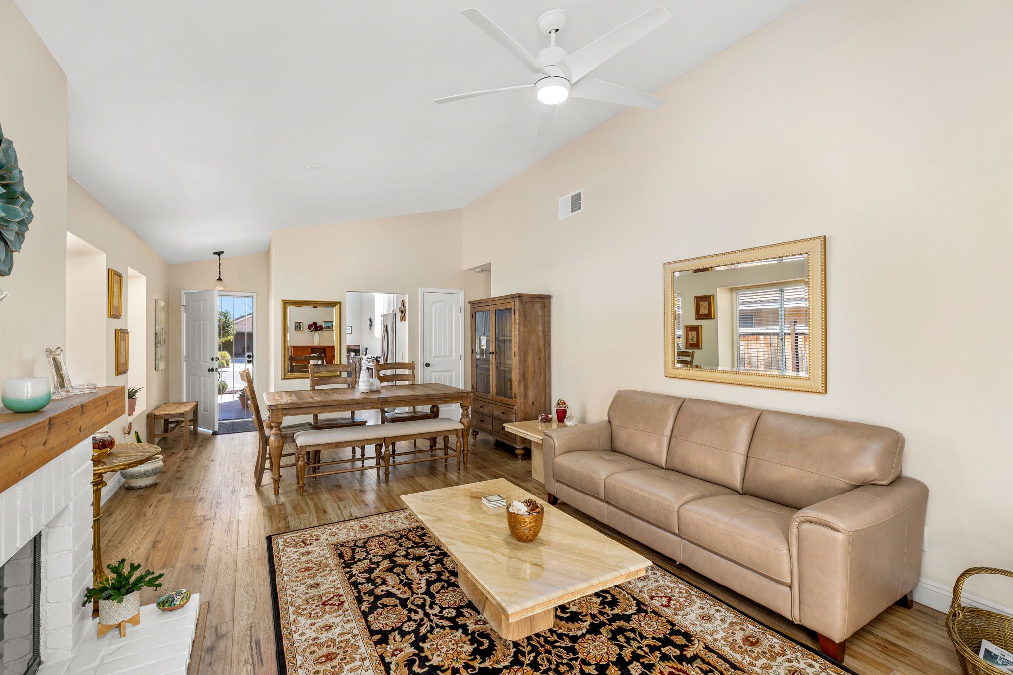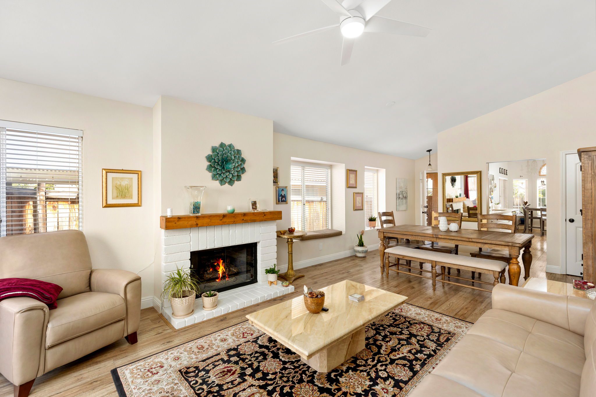 light and bright living room with a cozy fireplace, dining area and upgraded plank flooring throughout. The remodeled kitchen features