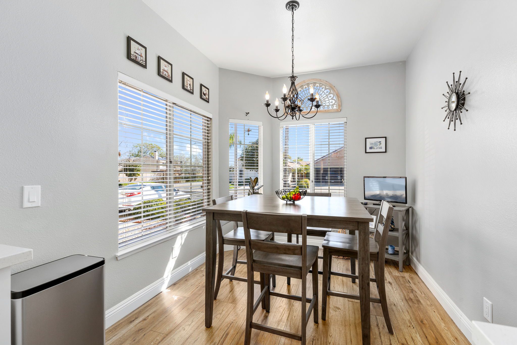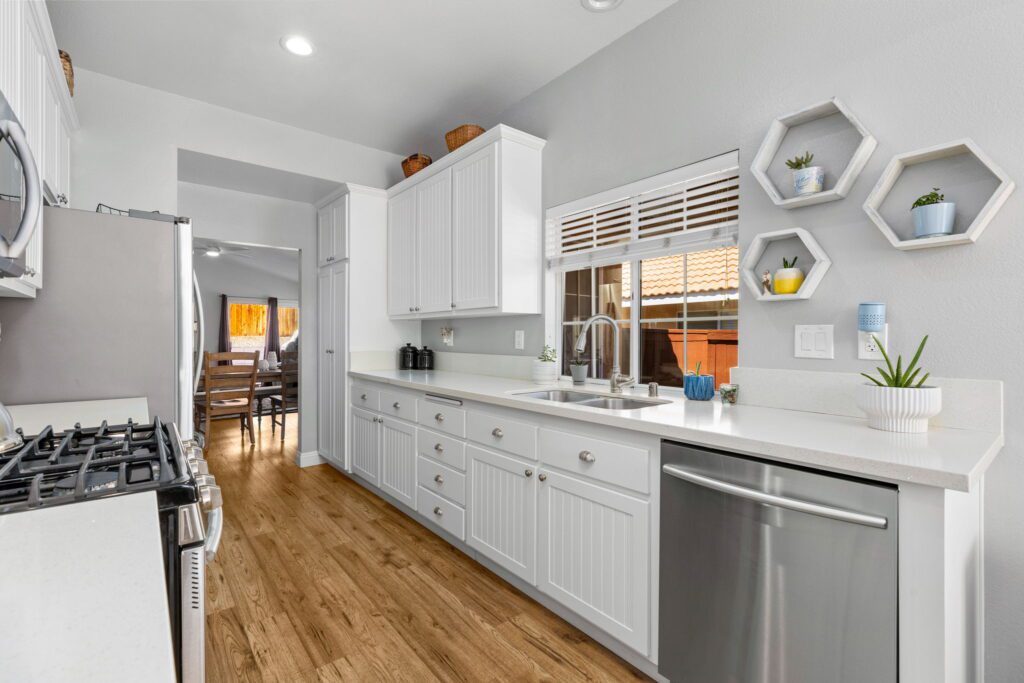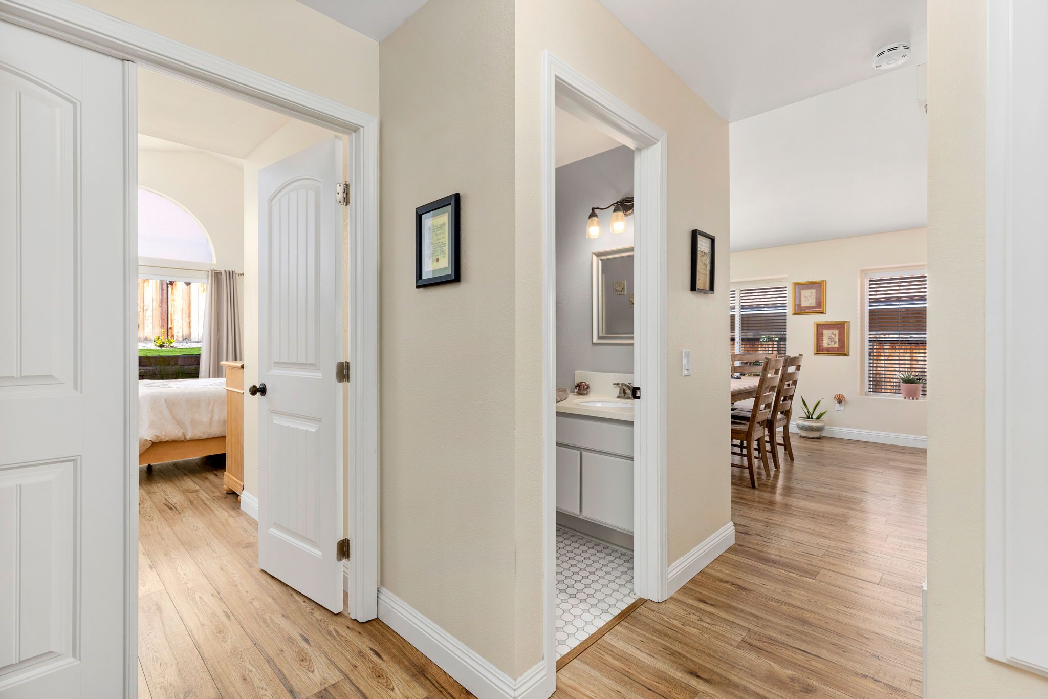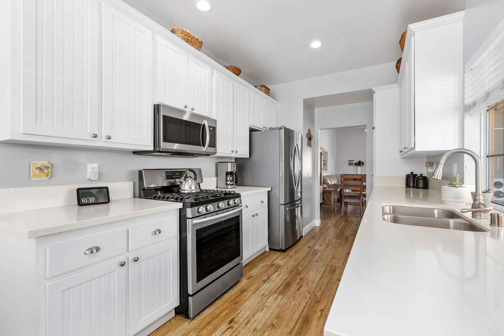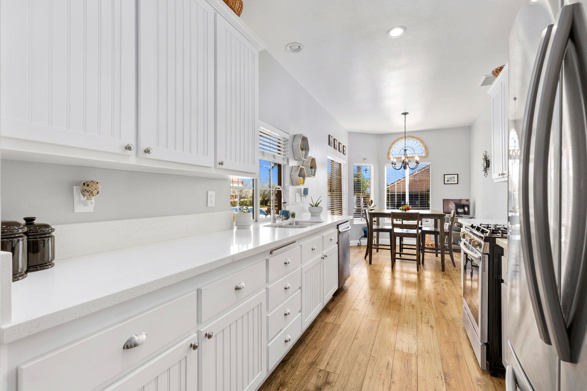 Quartz countertops, beautiful white cabinets, undermount sink, stainless steel appliances and an eat in breakfast area. Down the hall