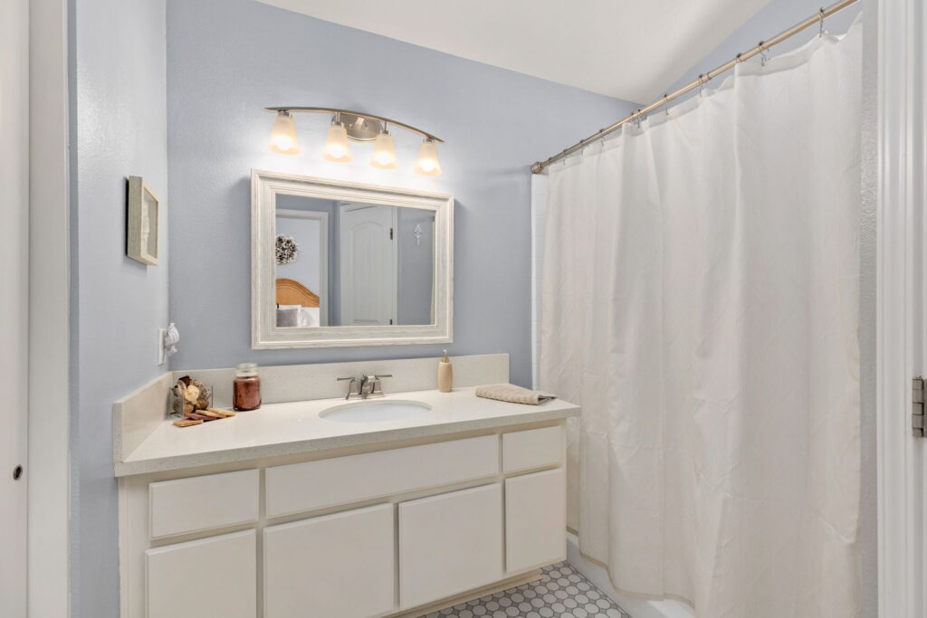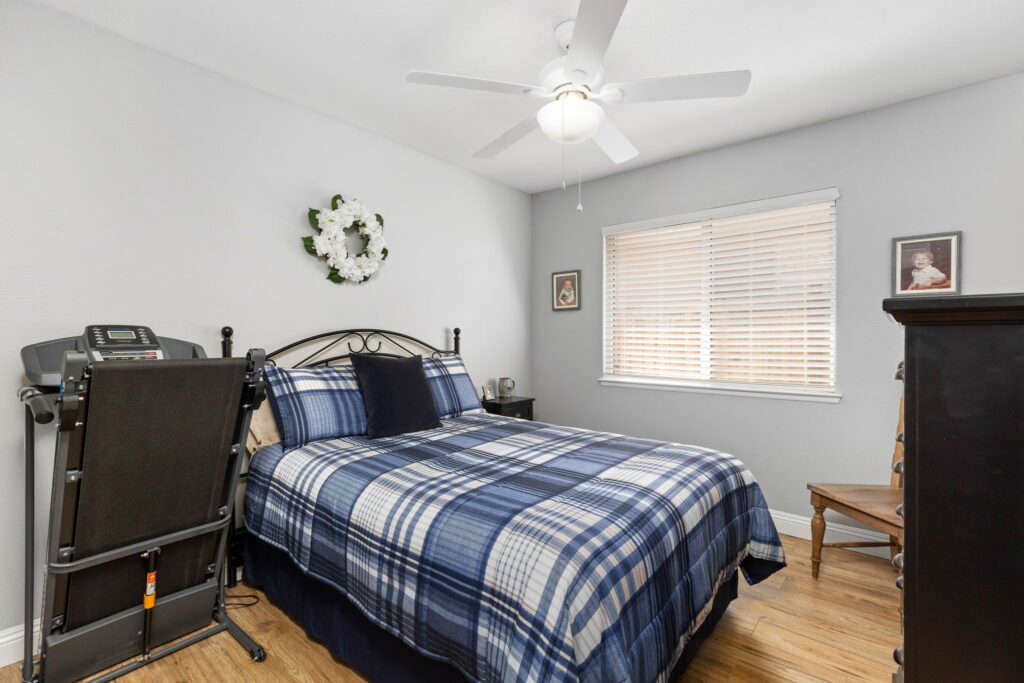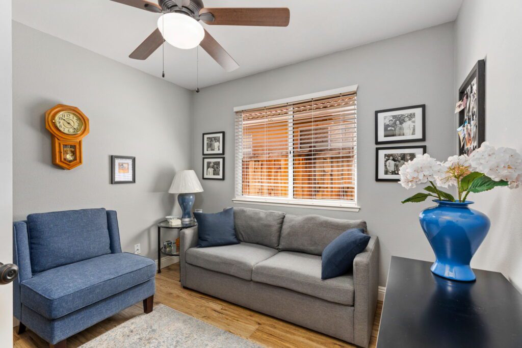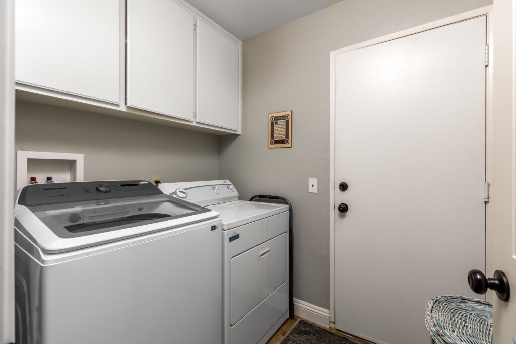 you find the indoor laundry room with storage cabinets, a guest bedroom/office, updated guest bathroom and the primary bedroom