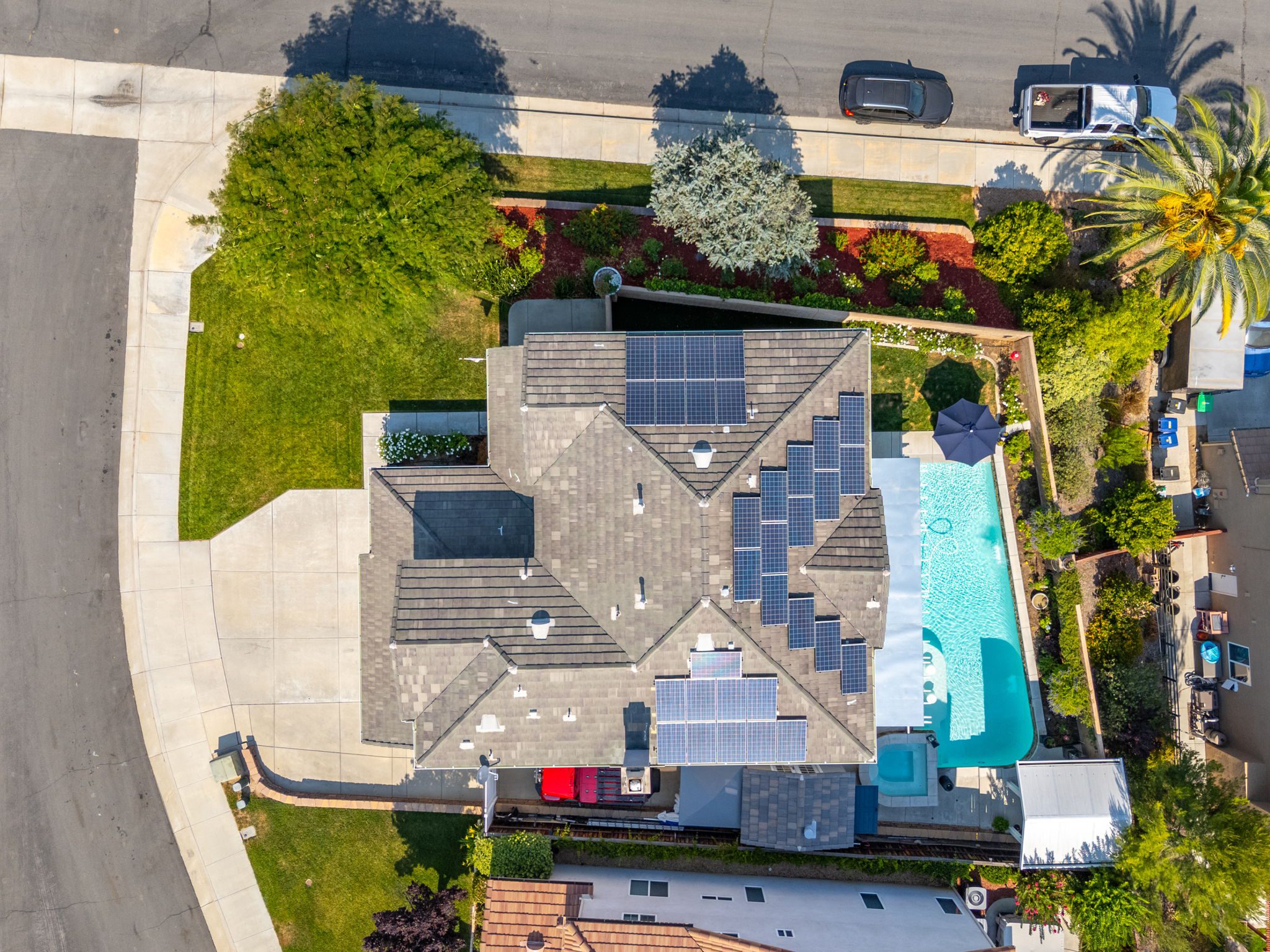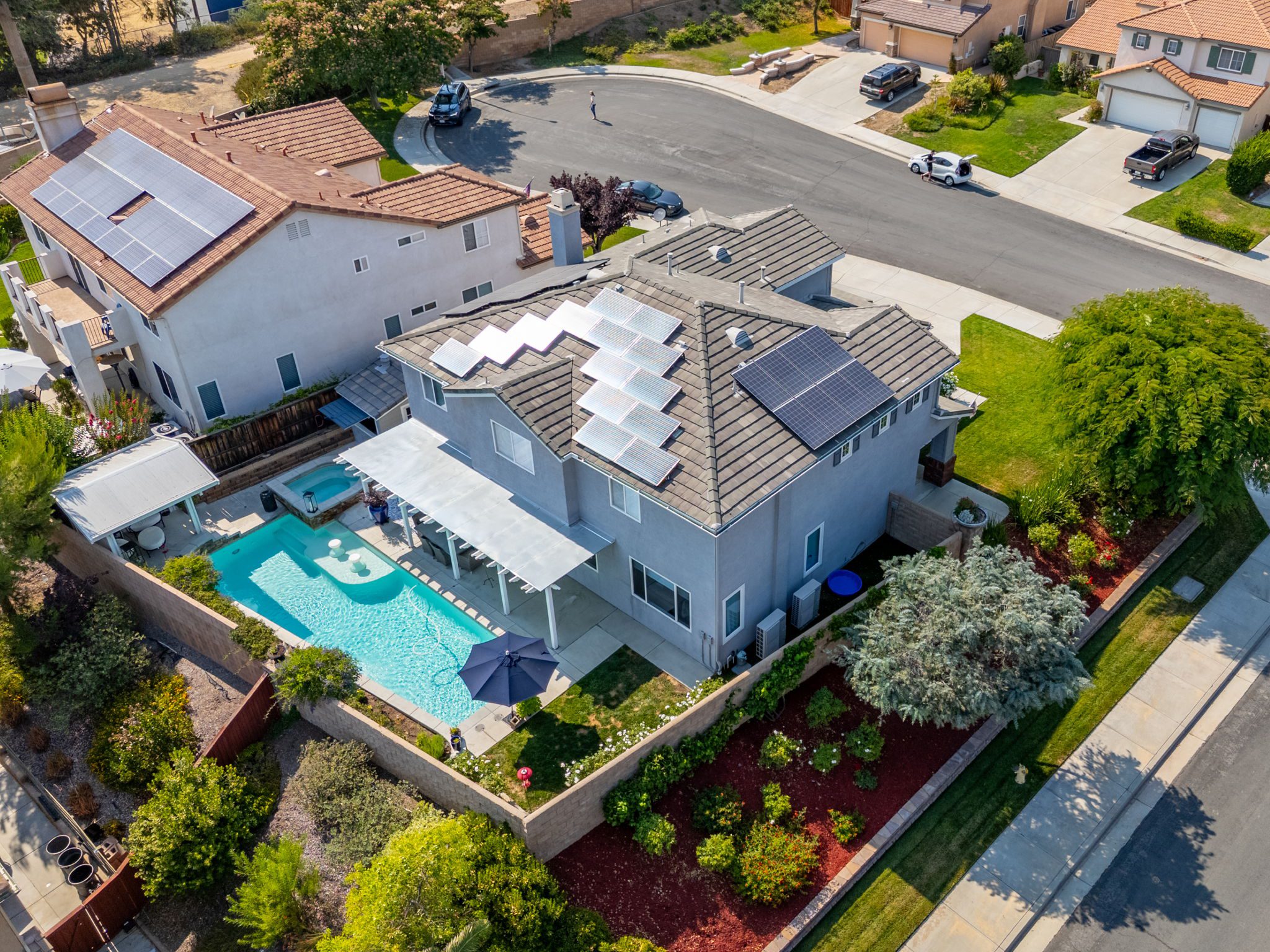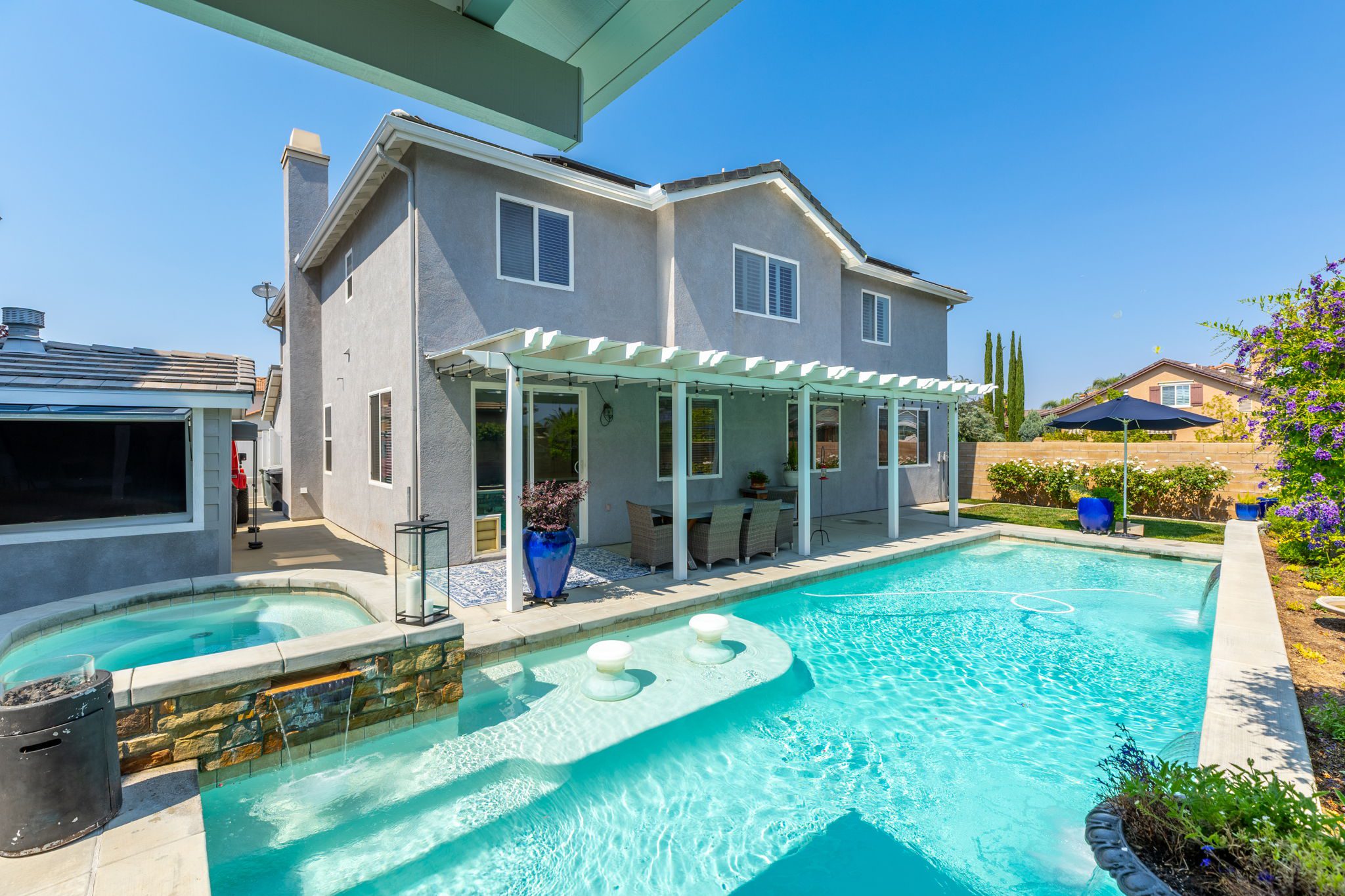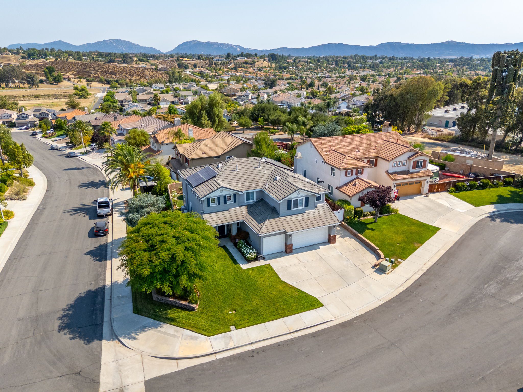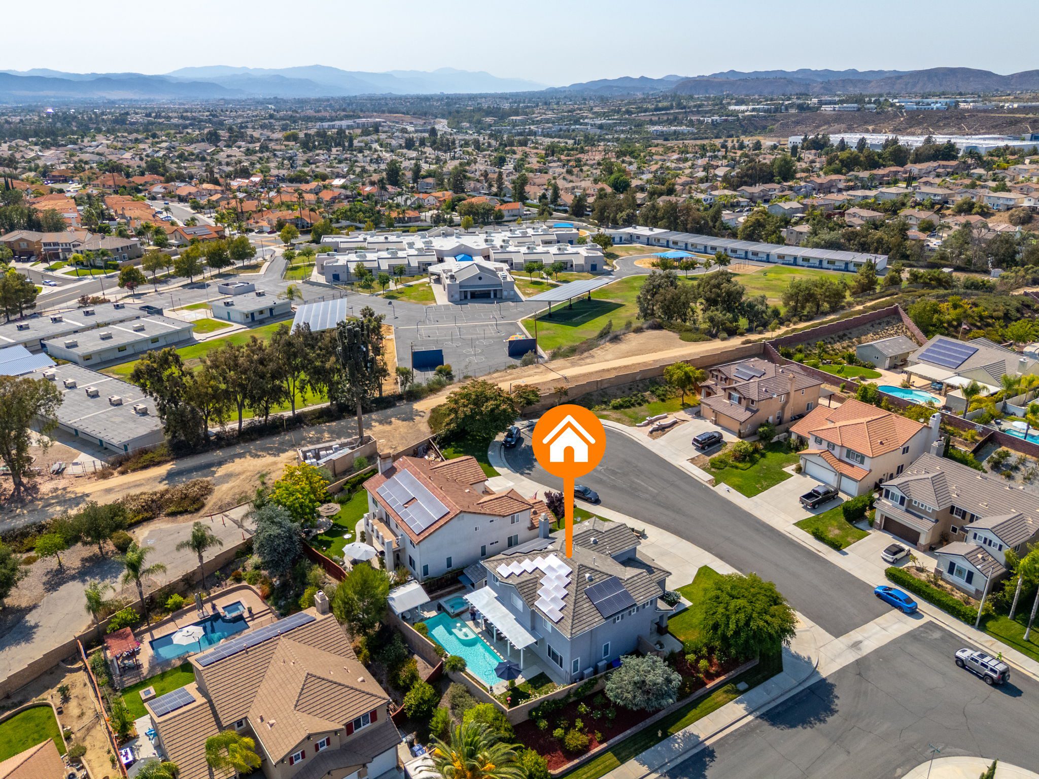 home is the perfect blend of style, function, and energy efficiency. The true showstoppers are the fully remodeled kitchen and the backyard oasis featuring a sparkling pool and spa, ideal for summer barbecues, relaxing evenings, and year-round entertaining. Perfectly positioned on a beautifully landscaped 8,712 sq ft corner lot, this 3,269 sq ft residence is designed with both comfort and practicality in mind. Step inside and you’ll find vinyl plank flooring throughout the first level complemented by many thoughtful upgrades throughout. The heart of the home is the completely renovated kitchen, boasting modern white shaker cabinets with tall upper cabinets and many custom built-ins like a coffee nook, spice drawers and organized storage pullouts. Stunning quartz countertops, high-end appliances, and generous prep space, make it a dream for any home chef. This home offers exceptional energy efficiency with 32 owned solar panels and a brand-new Samsung heat pump HVAC system, plus 5 strategically placed mini-split AC units for customizable comfort. A new Moen Flo and Halo 5 water filtration system supplies the home with pristine water as well as Smart Home controls and leak detection. The home features 5 bedrooms (4 up and 1 down) and 4 full bathrooms, giving everyone their own space. Step outside and discover a private backyard with a sparkling pool, raised spa, and mature landscaping that creates a serene retreat. Additional highlights include an oversized 3-car garage with EV hookups and RV potential on the side of the property, perfect for a smaller RV, boat, or other toys. This location in beautiful Temecula puts you close to everything. Just minutes from the conveniences of Winchester Road where you’ll find grocery stores, shopping, dining, and the Promenade Mall. Temecula’s wine country is only a short drive away, offering countless wineries and breathtaking scenery. With its modern upgrades, energy-efficient features, and entertainer’s backyard, this corner-lot gem offers an incredible opportunity to own a truly exceptional home in Temecula. With its modern upgrades, energy-efficient features, entertainer’s backyard, and a location within the boundaries of Temecula’s highly sought-after schools, this corner-lot gem offers an incredible opportunity to own a truly exceptional home in one of the valley’s most desirable NO HOA communities.