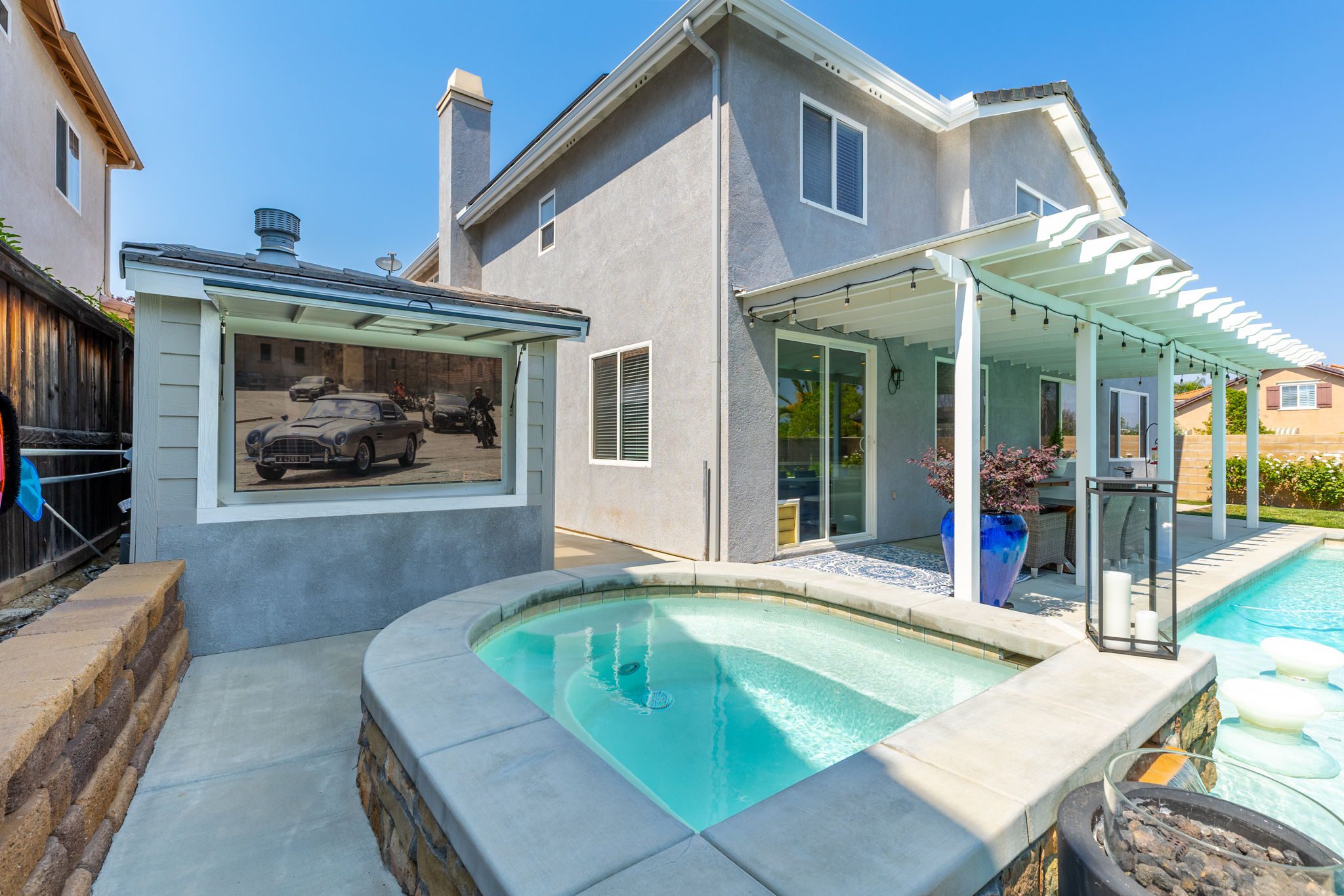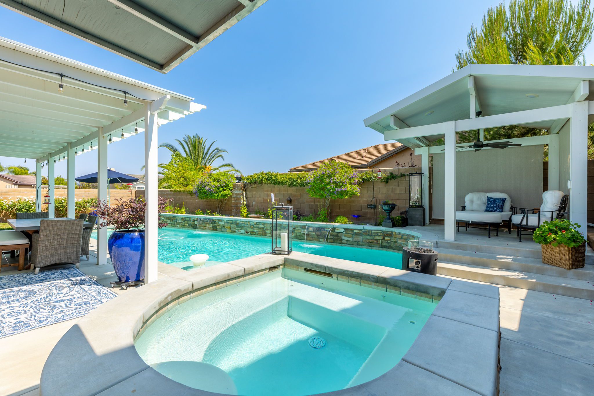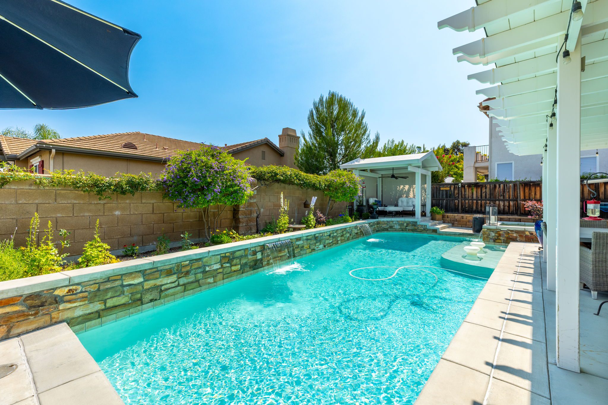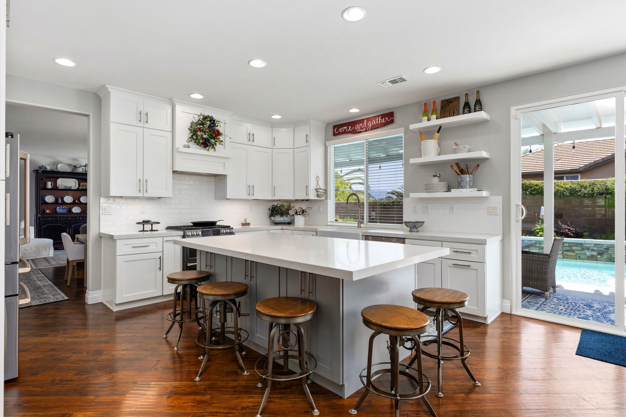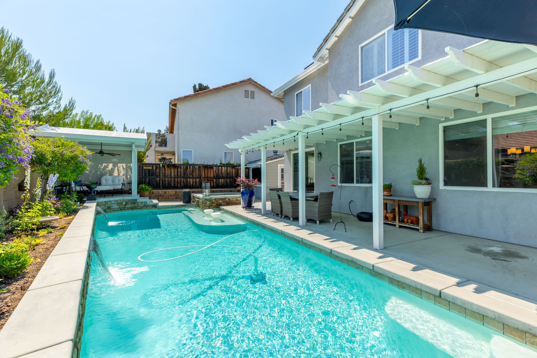 home is the perfect blend of style, function, and energy efficiency. The true showstoppers are the fully remodeled kitchen and the backyard oasis featuring a sparkling pool and spa, ideal for summer barbecues, relaxing evenings, and year-round entertaining. Perfectly positioned on a beautifully landscaped 8,712 sq ft corner lot, this 3,269 sq ft residence is designed with both comfort and practicality in mind. Step inside and you’ll find vinyl plank flooring throughout the first level complemented by many thoughtful upgrades throughout. The heart of the home is the completely renovated kitchen, boasting modern white shaker cabinets with tall upper cabinets and many custom built-ins like a coffee nook, spice drawers and organized storage pullouts. Stunning quartz countertops, high-end appliances, and generous prep space, make it a dream for any home chef. This home offers exceptional energy efficiency with 32 owned solar panels and a brand-new Samsung heat pump HVAC system, plus 5 strategically placed mini-split AC units for customizable comfort. A new Moen Flo and Halo 5 water filtration system supplies the home with pristine water as well as Smart Home controls and leak detection. The home features 5 bedrooms (4 up and 1 down) and 4 full bathrooms, giving everyone their own space. Step outside and discover a private backyard with a sparkling pool, raised spa, and mature landscaping that creates a serene retreat. Additional highlights include an oversized 3-car garage with EV hookups and RV potential on the side of the property, perfect for a smaller RV, boat, or other toys. This location in beautiful Temecula puts you close to everything. Just minutes from the conveniences of Winchester Road where you’ll find grocery stores, shopping, dining, and the Promenade Mall. Temecula’s wine country is only a short drive away, offering countless wineries and breathtaking scenery. With its modern upgrades, energy-efficient features, and entertainer’s backyard, this corner-lot gem offers an incredible opportunity to own a truly exceptional home in Temecula. With its modern upgrades, energy-efficient features, entertainer’s backyard, and a location within the boundaries of Temecula’s highly sought-after schools, this corner-lot gem offers an incredible opportunity to own a truly exceptional home in one of the valley’s most desirable NO HOA communities.