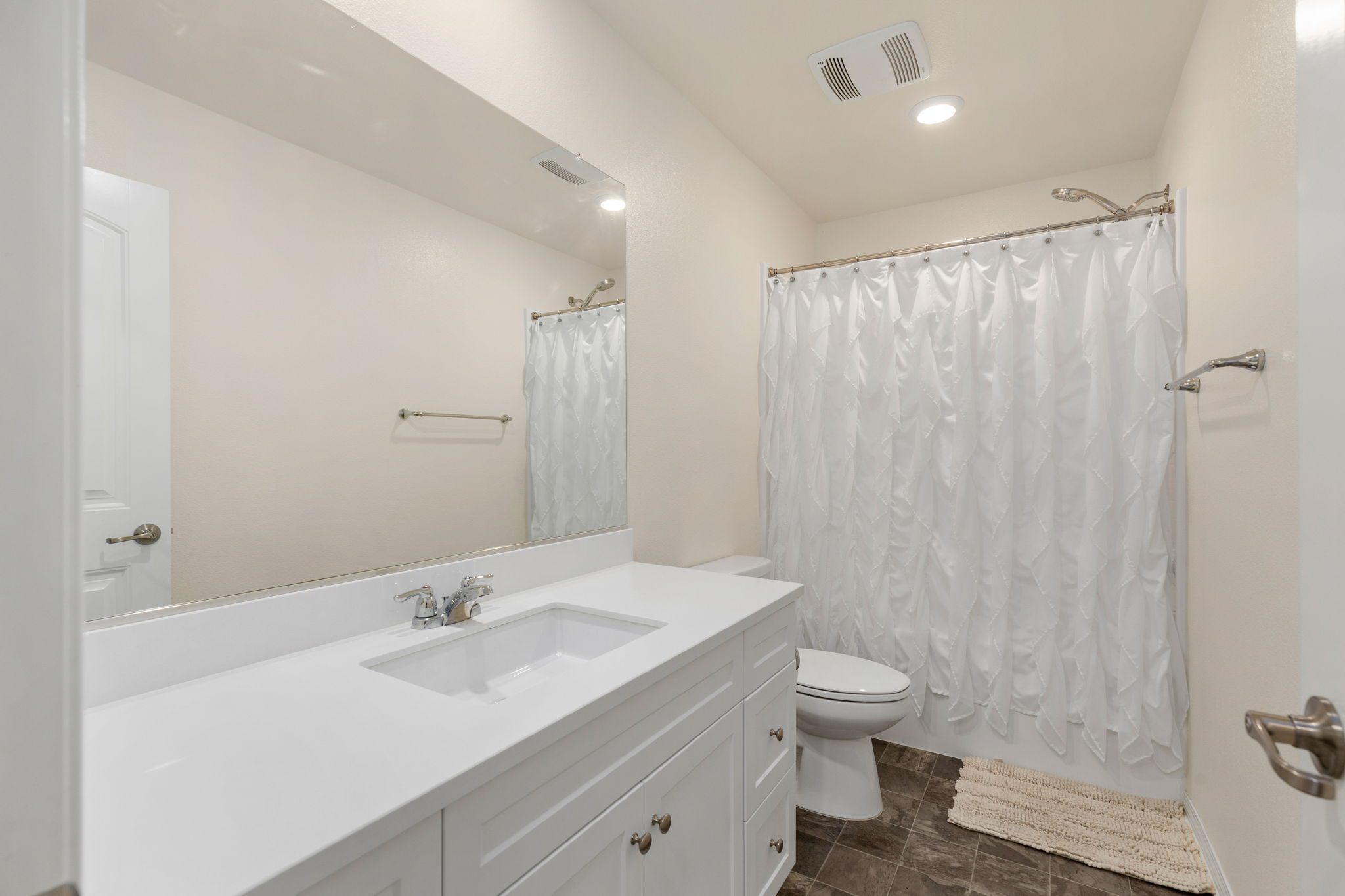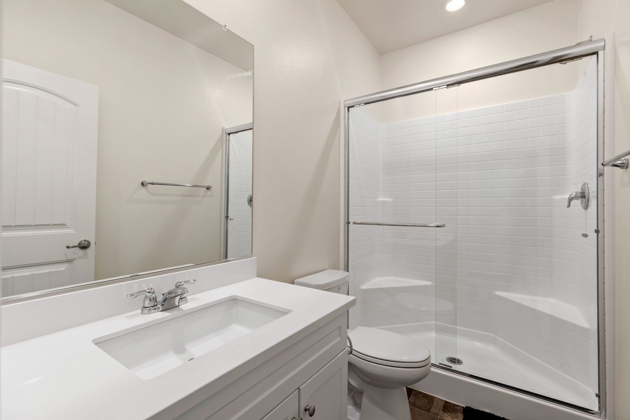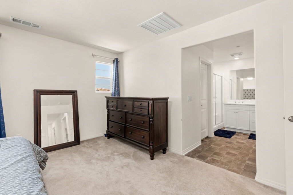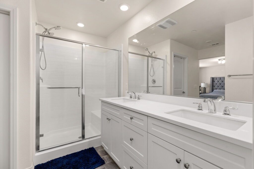 three bedrooms including the primary bedroom with en-suite bathroom, dual walk-in closets, double vanity sinks, and a walk-in shower.