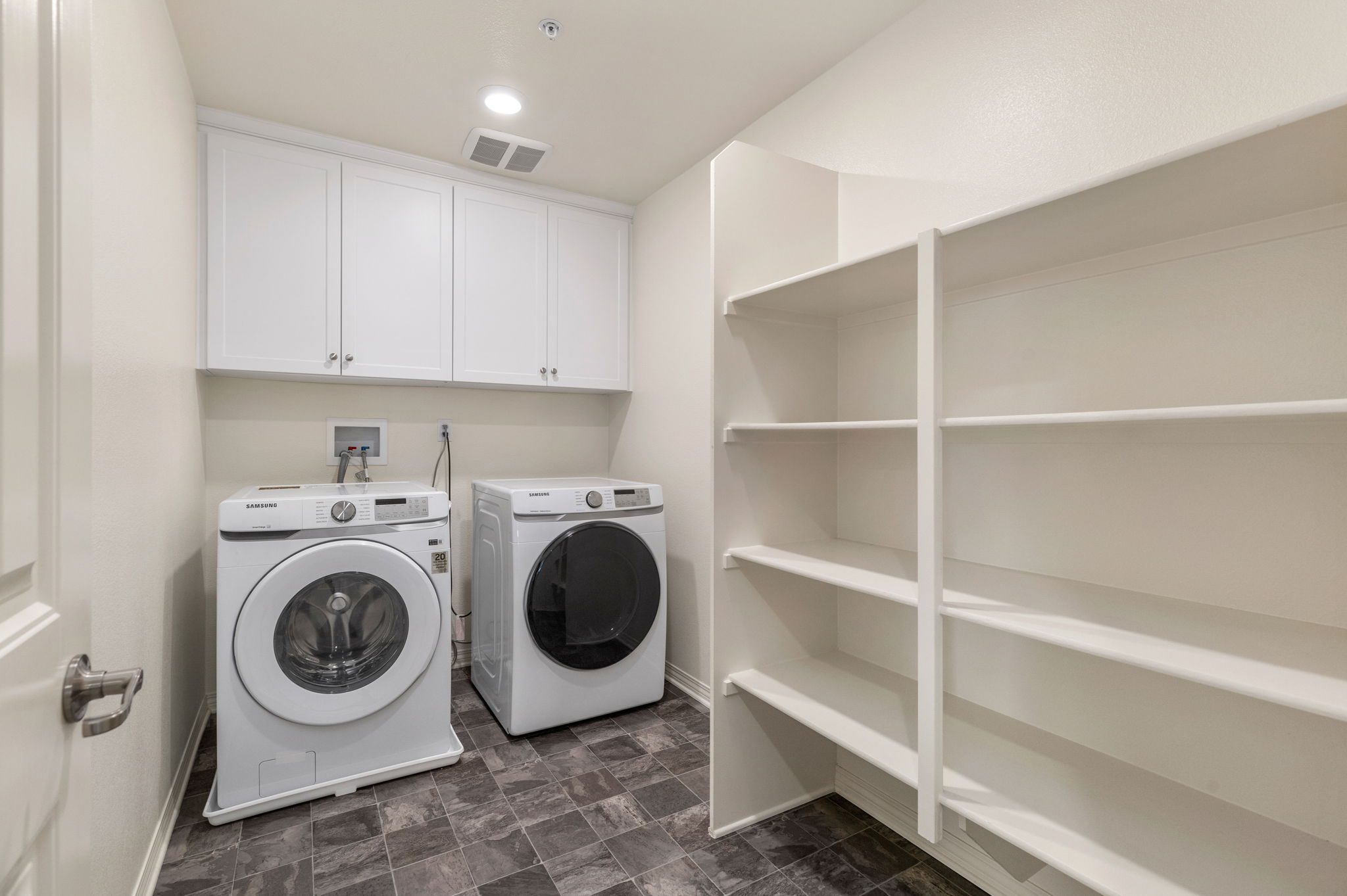 Plus, a convenient laundry room with lots of storage shelving and cabinets adds to the home’s functional design. Enjoy easy access to