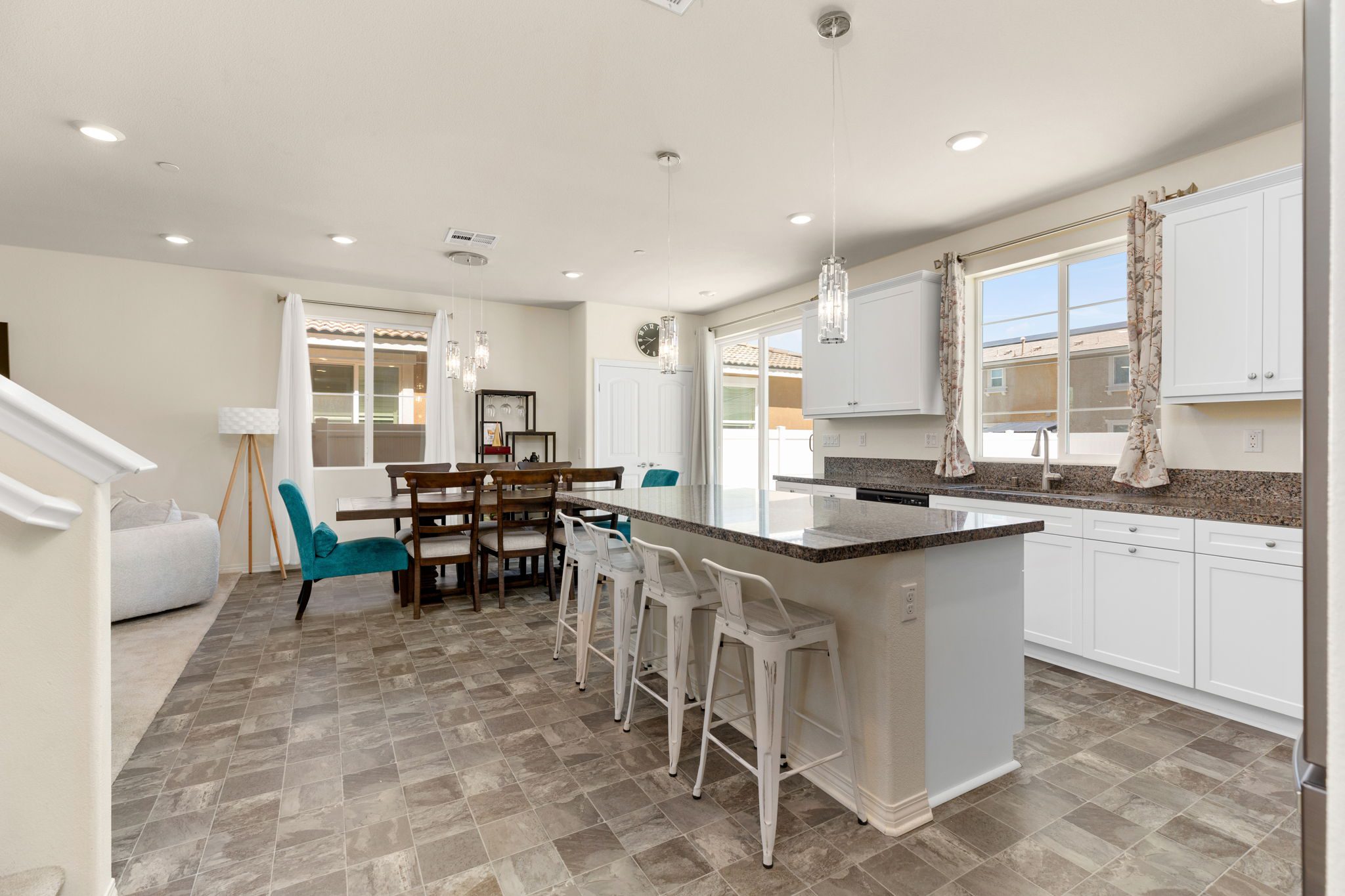 white shaker cabinets, granite counters, custom pendant lighting, a double door pantry, centered by a large island with seating for four.